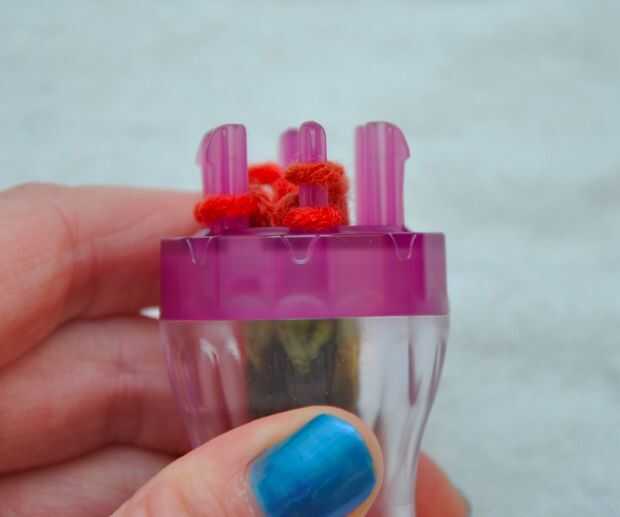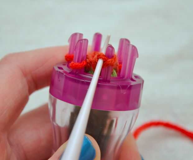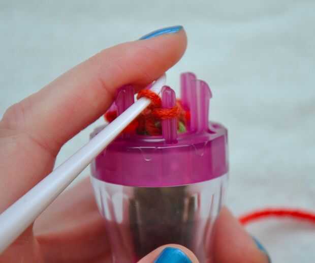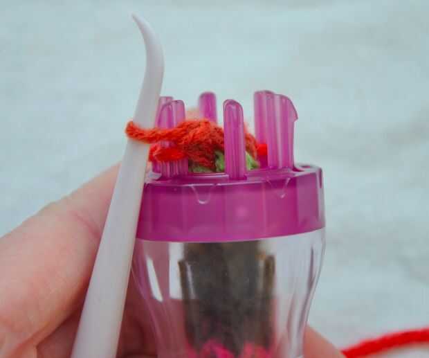 - Tomar este bucle y poner en el gancho de calcetero francés a la izquierda.
