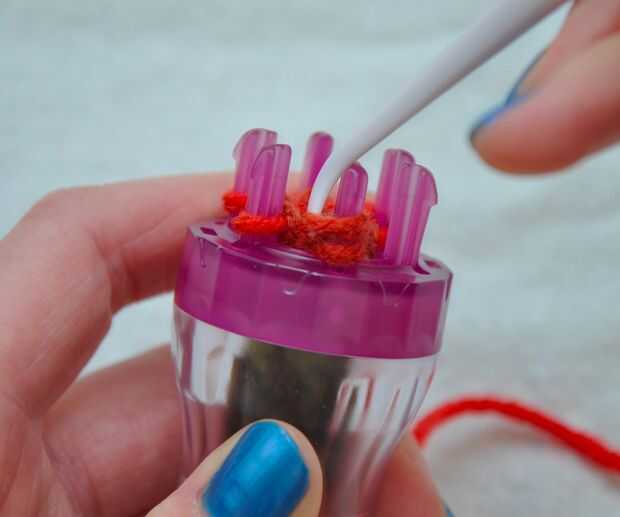 - Usando su gancho, bajar el hilo por el último lazo que tenía en su gancho cuando tomaste el cable apagado el calcetero francés.