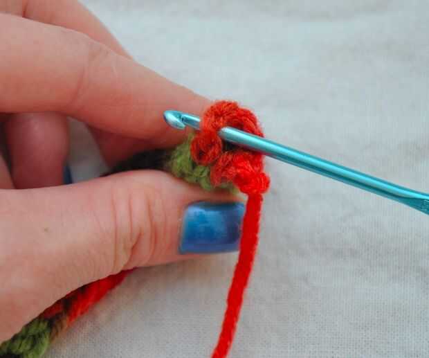 - Pegar un gancho de ganchillo a través del siguiente bucle de "V" de la cadena (siga a lo largo con las fotos lo mejor que pueda).