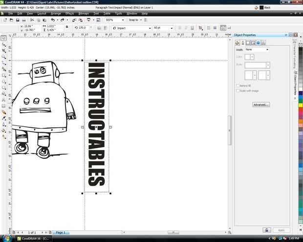 Usé la función de agregar texto a escribir "INSTRUCTABLES" en el programa. Se auto establecido en vertical y ya que adaptan bien, opté por no para girar a horizontal.
