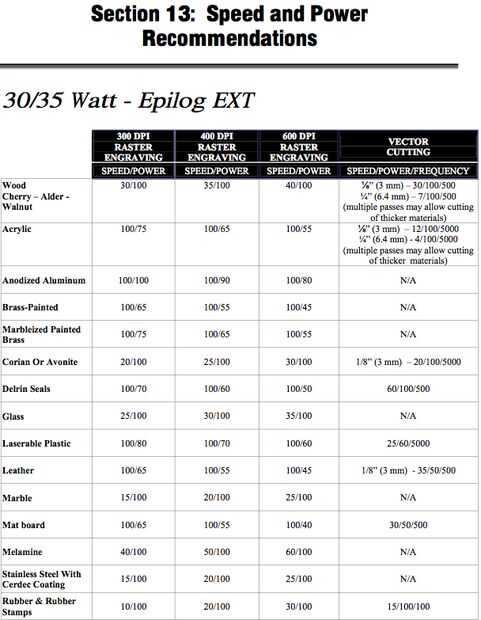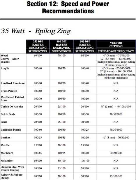 Dos de las siguientes imágenes son exceptúa de los manuales de instrucciones disponibles en sitio web epilogs. Como se puede ver, velocidad y poder difieren de una máquina a incluso cuando se utiliza la misma potencia. Así que por favor, prueba el material primero.