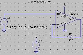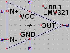 Eso es todo ahora! El nuevo símbolo y el asociado Modelo Descripción están listos para ser usados en un esquema nuevo. Debe guardarlo en: C:\Program Files\LTC\LTspiceIV\lib\sym\Opamps\LMV321.asy. Ahora, simulará un repetidor simple circuito construido alrededor del símbolo de LMV321 que acaba de crear. Antes de continuar, cierre la aplicación LTspice y luego ábrelo otra vez, para permitir que actualizar y actualizar su lista interna de símbolos y modelos. Una vez hecho esto, crear un nuevo esquema y dibujar este circuito. El símbolo de la LMV321 puede encontrarse en la subcarpeta de las carpetas de la biblioteca OPAMPS