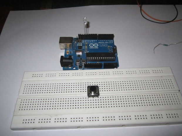 1. poner el interruptor en el tablero y poner un LED con el extremo más largo en el pin 13 y el extremo más corto a la Gnd de Arduino.
