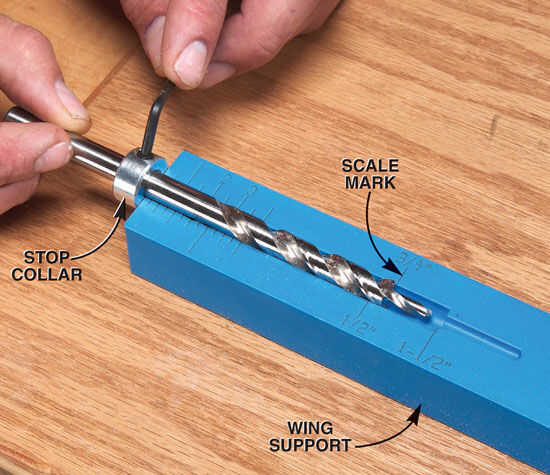 Establece el collar de parada sobre la broca para que la broca penetra una distancia adecuada en la madera. En esta foto, usted perforación en bolsa de 3/4".