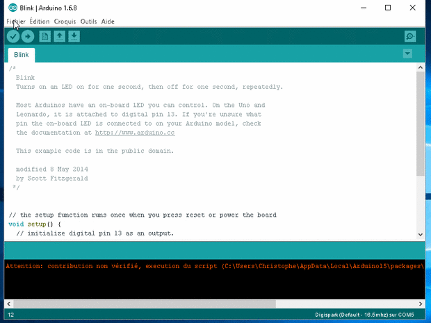 L'IDE Lancez Arduino (supérieur à 1.6.4) et ajoutez le chemin vers la librairie Digistump dans les préférences