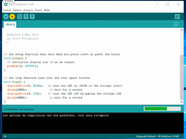 Ouvrez le programa Blink dans les ejemplos Arduino et modifiez le Pin de la Led à 3.