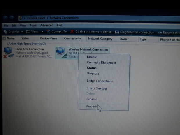 entonces debe estar en esta página (mirar foto) el click derecho sobre "conexión de red inalámbrica" e ir a "propiedades" y haz clic en el que