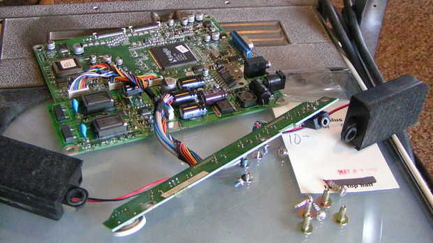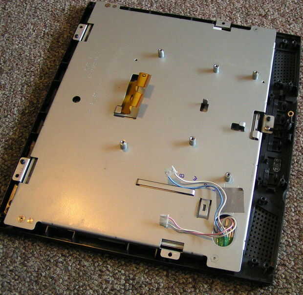 El monitor muy probablemente tendrá una cubierta de metal que primero debe ser sacada. Como se puede ver en las fotos, mi monitor tenía una caja en la parte superior con todas las "entrañas" (un tablero de PC con todo que el monitor necesita para funcionar), que son necesarias más tarde. En la foto, son los conectores a la luz de fondo hacia la parte inferior, y necesitan ser removidas. En el mismo cuadro, el cable de cinta a las necesidades de izquierda para ser desconectada, pero es necesario más tarde.