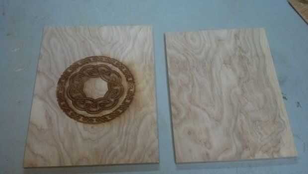 Golpe < ctrl >< un > para seleccionar todos los vectores para ser dibujado, observe que hay un rectángulo blanco del tamaño de la Junta de arte, asegúrese de que este es seleccionado, el rectángulo hará el arte centrado automáticamente en la tapa, si pones la tapa en la parte superior izquierda del laser con el lado largo en la parte superior. Golpe de impresión y siga las instrucciones de grabado en una pieza de contrachapado de abedul (100%, velocidad 80) que se redujo la velocidad hasta unos 30 para obtener un más profundo etch, pero en unos tableros que quemado a través de huecos en las capas internas de la madera, así que esta es su llamada.