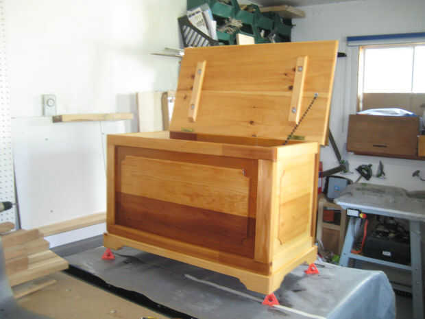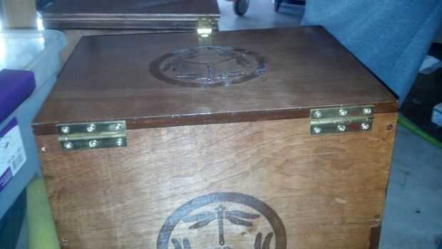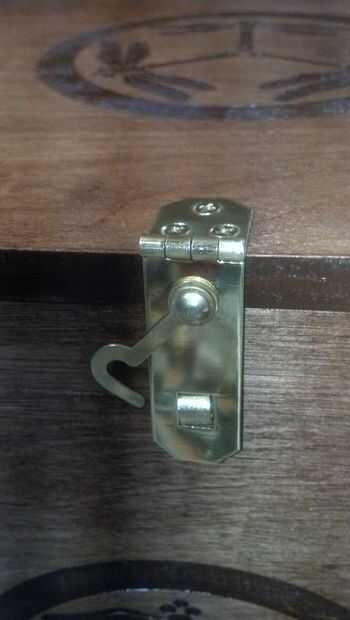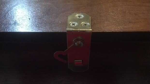La parte difícil es escoger las bisagras y el cerrojo. Como la tapa es solamente ½" de espesor, o bien necesita un hings que cabe en ese pequeño un área, o uno puede poner una curva de 90 grados en una mordaza y tornillo en el borde y en la tapa. Un cerrojo es ambos opcional y fácil, simplemente elegir uno puede enroscar en la parte superior de la tapa y atornille el lazo en la parte frontal de la caja.