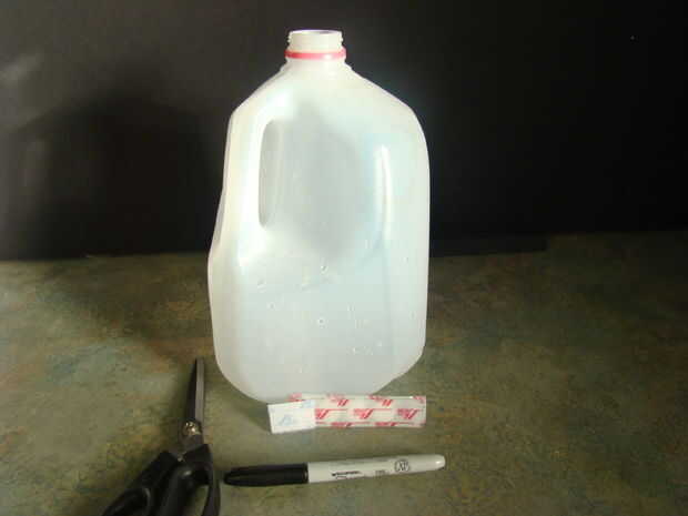 Fuentes: Jarra de leche limpia, vacía Marcador permanente Seco borra el marcador Tijeras Cinta Puntos de Velcro adhesivas Papel de tejido, (cualquier color) Pintura de aerosol de plástico (si quieres)