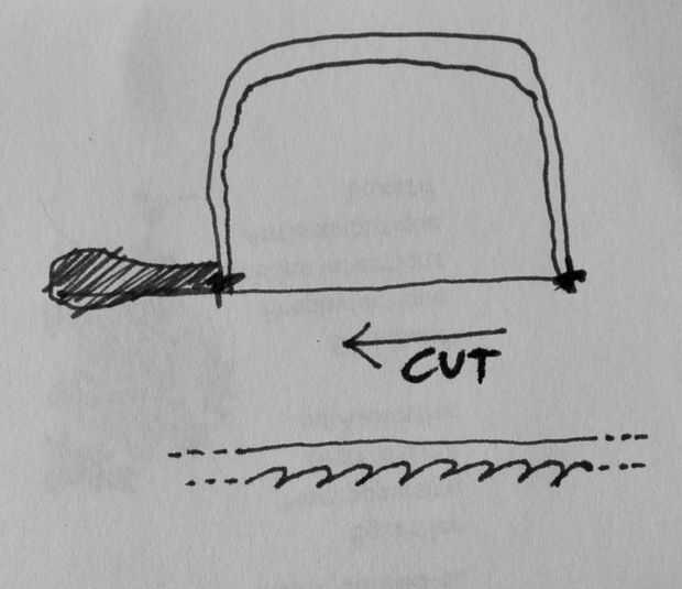 Con el dedo siento la dirección de la hoja. Tienes que colocar en la sierra, por lo que cortará tirando, no empujando.
