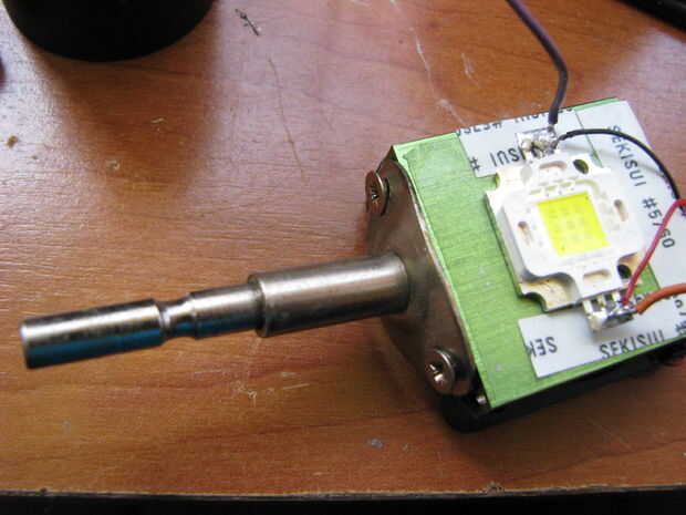 Disipador de calor está preparado de esta manera: Retire la película protectora y poner un led en cinta adhesiva. Soldar los cables a + y + lado del led con el ventilador de forma de cable rojo y negro.