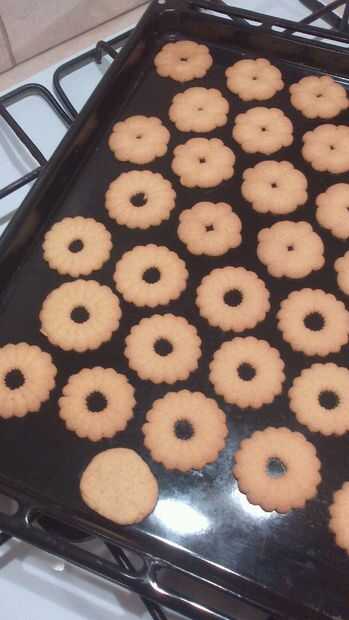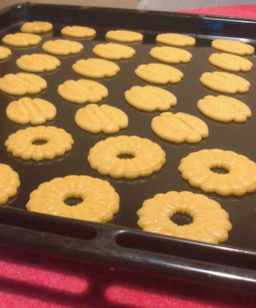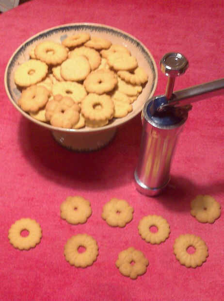 He comprado en Internet algo totalmente nuevo para mí: una prensa galleta. Es básicamente una jeringa grande, eran pones galleta masa dentro, y empujando la masa a través de casquillos específicos puede crear galletas de mantequilla pequeña.