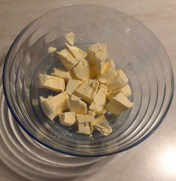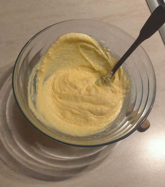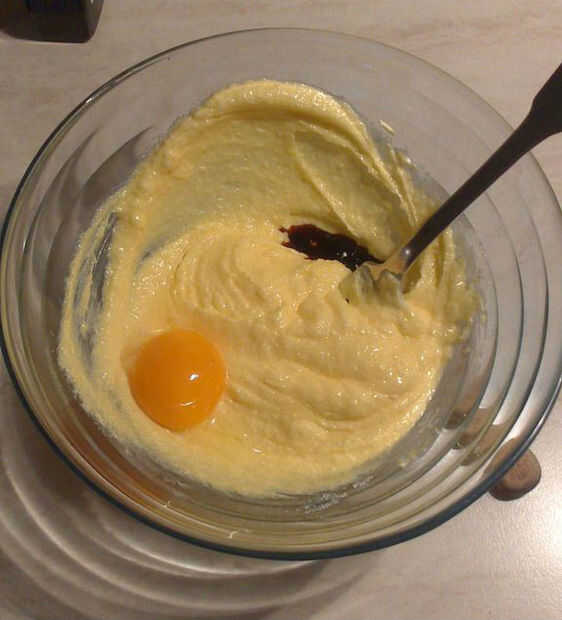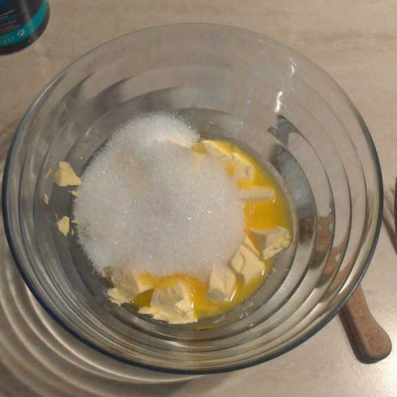 OK, haz la mantequilla, cortado en cubitos en un recipiente y ponerlo en el microondas durante unos 10 segundos, sólo para calentar la mantequilla. Una vez hecho esto, agregar el azúcar, el extracto de vainilla, una pizca de sal y una yema de huevo. Mezclar todo.