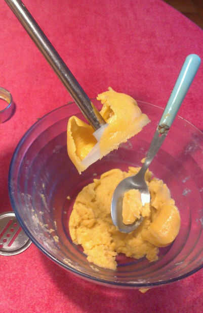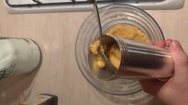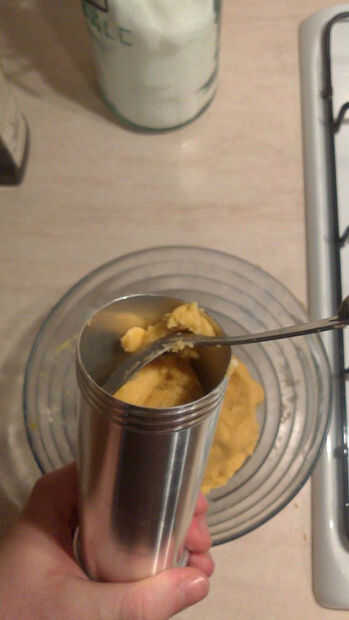 Abrir la prensa y rellenar con parte de la masa. Utilice sus dedos o una cuchara. Elegir un gorro, poner dentro de la tuerca, luego cerrarla. Mi prensa tiene dos ajustes de tamaño de salida, depende de la PAC. Utilicé grandes y pequeños ajustes.