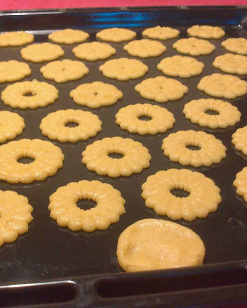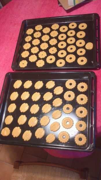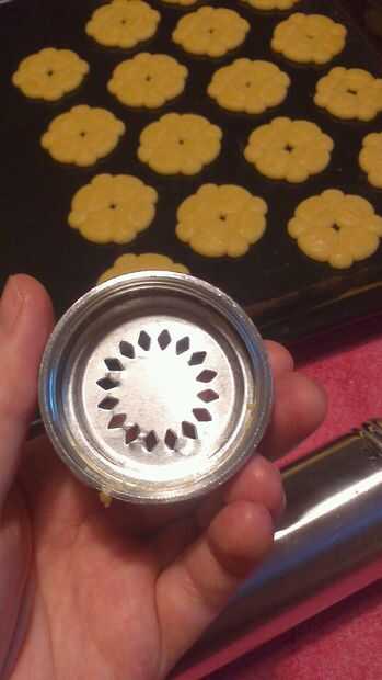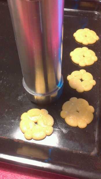 Una vez que la prensa está vacía, directamente no llenarlo otra vez, pero abrirlo completamente: hay pasta detrás del émbolo. Quitar (puesto nuevo en el bol de masa), coloque el émbolo en el cilindro, luego llene la prensa otra vez. He probado dos capas más. Una vez más, puede que necesite cambiar el tamaño de las galletas. Ten cuidado, no mezclar galletas grandes y pequeñas en la misma plancha, ya que los tiempos de horneado son diferentes.
