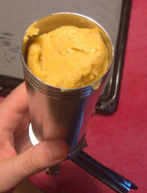 Así, puso la prensa hasta la placa metálica (en contacto), luego empuje la palanca hacia abajo. Mueva con cuidado la prensa. Debe tener una buena galleta. Si el resultado es horrible, sólo poner las galletas en el bol de la masa y vuelva a intentarlo. Usted necesitará algunos intentos para obtener un buen resultado. Si la galleta es muy pequeña, pruebe el ajuste más grande.