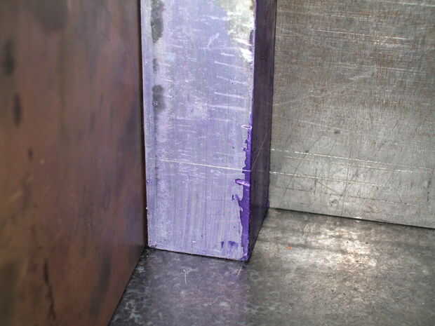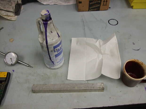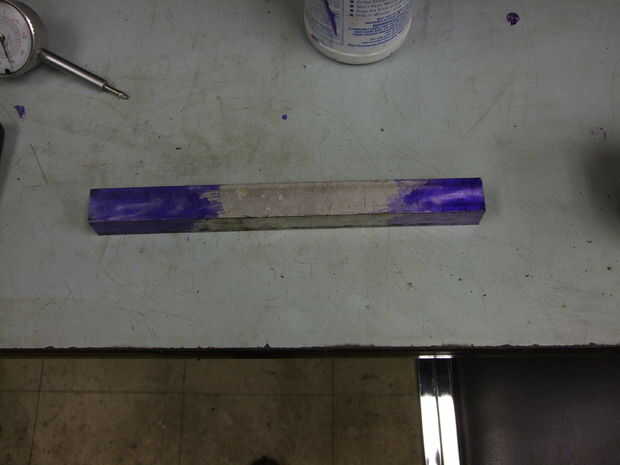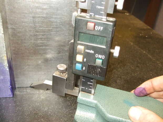Primero, mida y marque la pieza de trabajo. Con un poco azul Dykem hace mucho más fáciles de ver, la línea trazada, pero no es absolutamente necesario. Utilice cualquier herramienta es apropiado para marcar la línea de corte deseada. Aquí, uso una altura digital calibrador y haga una marca a una pulgada del extremo.