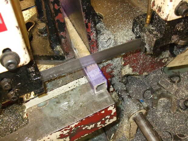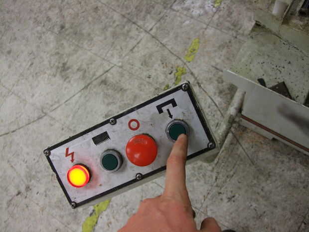 Con la velocidad de alimentación a cero, desactive la emergencia parada (gire la perilla en sentido antihorario hasta que hace estallar hacia fuera). Presione el botón de alimentación y gire la perilla de velocidad para bajar la cabeza de Sierra de cinta. Mantener un ojo sobre la tasa de descenso, bajar la cuchilla hasta que esté justo por encima de la pieza de trabajo. Vuelva a enganchar la parada de emergencia y establecer la velocidad de alimentación a cero.