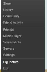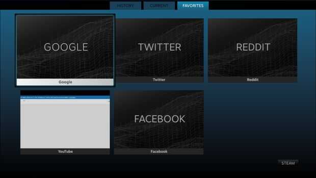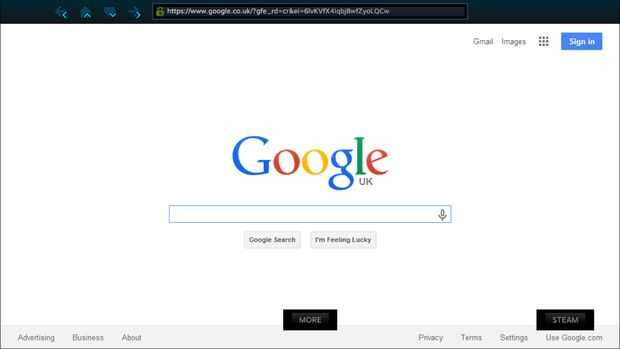 La navegación en vapor es un poco más confuso. Abrir vapor e ir a la parte superior de la pantalla y golpear "Vista" luego ir a "Modo de imagen grande". Deberá haga clic en "Guardar" y vaya a la abajo a la izquierda de la pantalla y golpear "WEB" y listo ahora. Realmente puede usar un gamepad para navegar! Utilizar los desencadenadores para cambiar de pestaña; y así sucesivamente. Si tiene vapor en el área de notificación, haga clic en el icono de vapor y golpe "Panorama". Para ir hacia atrás Presione «Vapor»