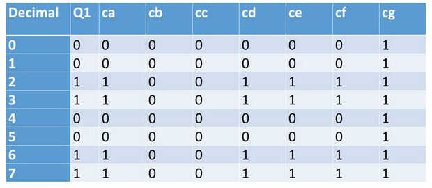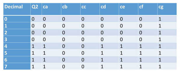 Después de eso, decidimos la lógica para el siete segmento en cada dígito. Igual que enable_Dx, cx es señal baja activa. Así que, para encender el segmento, tenemos que conducir la FPGA a la baja. Aquí están las tablas de verdad para el Qx (Q2, Q1, Q0) y ca-cg (ver tablas)