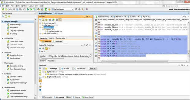 Haga doble clic en el Basys3_master.xdc. Luego, ver códigos que describen todas las entradas físicas y propiedades de salida. Cuando borramos "##", las declaraciones serán no comentadas para que podemos usar estos pines. Todos los pines FPGA en el maestro xdc se agrupan bajo el mismo periférico. Por ejemplo, si usted quiere encontrar pins para display de siete segmentos, simplemente haga clic en "ctrl + F" y escriba "7 segmentos display" encontrará a todos los pines como dígitos permite y las conexiones del segmento. Cambiar el nombre de los puertos utilizados (en cada línea, después de get_ports) según los nombres de señal de nivel superior en el proyecto