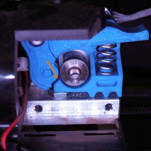 Si tienes una impresora 3d diferente, usted debe comprobar fuera Thingiverse para bloques de disco que utilizan un resorte y un rodamiento de rodillos que se ajuste a su impresora. Debe haber un espacio muy pequeño (flecha naranja) debajo del rodamiento y el engranaje impulsor y el agujero donde va en el extremo caliente de la extrusora. Ninjaflex es como un tallarín mojado y una brecha excesiva aquí permitirá a flex y mermelada.