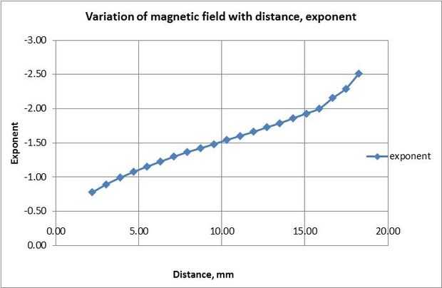 Usando las ecuaciones anteriores, analiza datos para determinar el exponente m para distancias de 1,28 mm (casi rozando la mesa de la sierra) 18,26 mm (apenas perceptible de la fuerza del imán). Sólo a una distancia de unos 16 mm el campo magnético sigue la ley inversa del cuadrado (exponente = -2). Como el imán consigue manera más lejos de la sierra, el exponente es más grande y es-aproximadamente 2,5 mm 18,26. "Adivinó" que si mi dispositivo de prueba fue bastante sensible, el exponente acercaría -3, lo que indicaría la ley de la inversa del cubo.