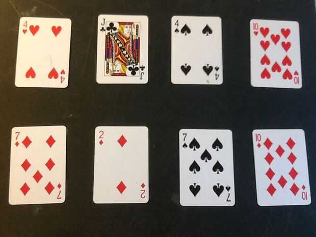 Inicio por repartiendo las cartas hasta que hay ninguno izquierda. Entonces ambos jugadores establecen las primeros 4 tarjetas en la parte superior cubierta allí sobre la mesa. Debería verse como la imagen.