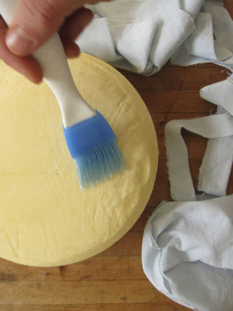 Establecer un área de trabajo que puede llegar a ser desordenado (difundir periódicos o papel de cera sobre mi mesada para una fácil limpieza). Luego cubrir la parte superior de la rueda con una fina capa de grasa. Utilizo un pincel de repostería pero podría también cuchara sólo algunos grasa en el queso después embadurnamos con sus extremidades del dedo.