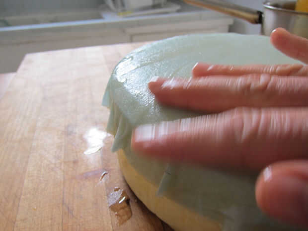 Una vez que hay una capa de grasa, tomar una de las hojas de paño limpio y seco y sumergir en la grasa derretida. Sacuda el exceso gotas y luego extender sobre la parte superior del queso. Utilice sus dedos o un pliegue de hueso para expulsar cualquier burbuja de aire.
