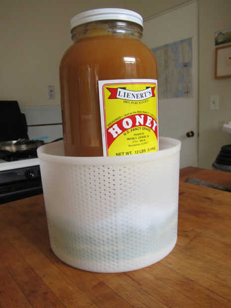 Una vez que haya completado un queso envasado, debe repetir pasos 5 a 7. Entre la envoltura de la primera y la segunda, colocar el queso en su forma original y agregar la presión. Aquí, yo he rematado el queso una vez envuelto con un plato de ensalada, luego una pesada jarra de miel.