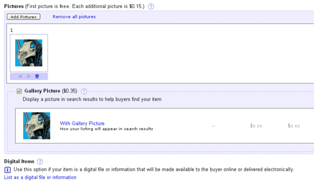 eBay te permite subir una imagen libre y te da la opción de actualizar a un listado de Galería (la imagen se mostrará junto a los resultados de búsqueda) para un honorario. Sin embargo, usted debe pagar para más fotografías, que es un costo innecesario. Sube tus fotos en su lugar a un host gratuito como www.imageshack.usy utilizar el código HTML para insertar imágenes en tus subastas gratis.