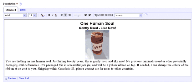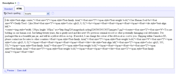No tiene que ser algo súper lujo, sólo describir el elemento mejor que puedas. Esto es donde se incluyen las fotografías, así como de envío retorno costos políticas, etc.. Si sabes HTML, puede codificar su subasta por el cambio de la ficha de otra manera, puede utilizar el editor WYSIWYG estándar para realizar la subasta.