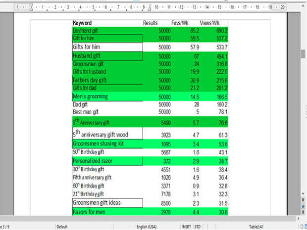 Cálculo de Marmalead: Elegir 20-30 de las palabras clave más relevantes y luego dirígete a Marmalead para compilar una hoja de cálculo con la cantidad de vistas favoritos semanales y anuncios de la competencia.