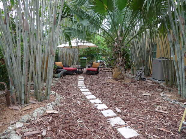 Para mi casa fue el patio lateral, era grande pero tenía un espeso follaje de los árboles que no hierba crecería allí. Era realmente muy poco atractivo. 3 pallets de pino corteza pajote y muchos días de trabajo después, se convirtió en un oasis de estilo Zen. La noche que finalmente acabó que me fui a dormir en una de las tumbonas, las hojas de bambú hecho este suave susurrante sonido de la brisa y nunca olvidaré cómo estaba después de lograr algo de que estaba tan orgulloso en paz.