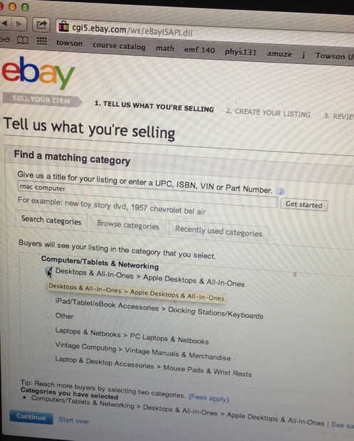 Para el artículo: navegar por la lista sugerida, una vez que encuentre de tu artículo categoría correcta : Marque la casilla a la izquierda de la categoría deseada y luego desplácese hacia abajo y haga clic en la ficha azul "continuar"