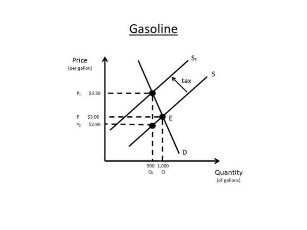 Nota: el impuesto impuesto ha cambiado el precio de equilibrio a 30 centavos a P1 (los consumidores ahora pago $3,30 por galón de gas) y hacia abajo de 10 centavos a P2 (productores ahora reciben $2,90 en ingresos por ventas por galón de gas).