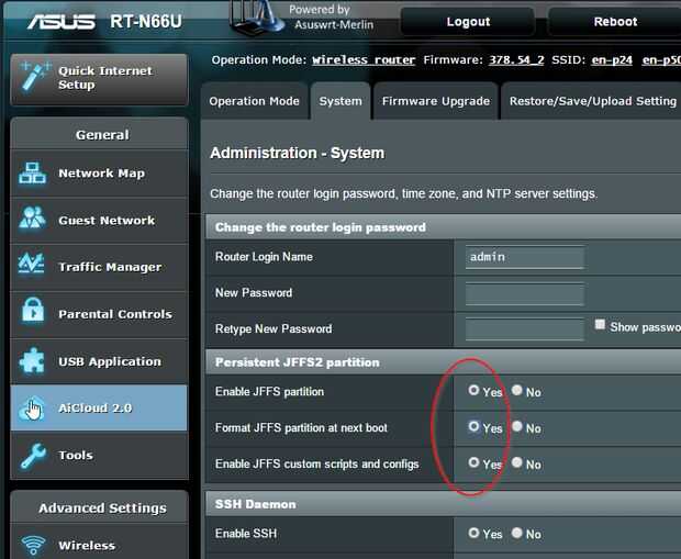 - Ir a: Administración -> sistema. Permitir que todas las cosas de JFFS. Pulse aplicar.