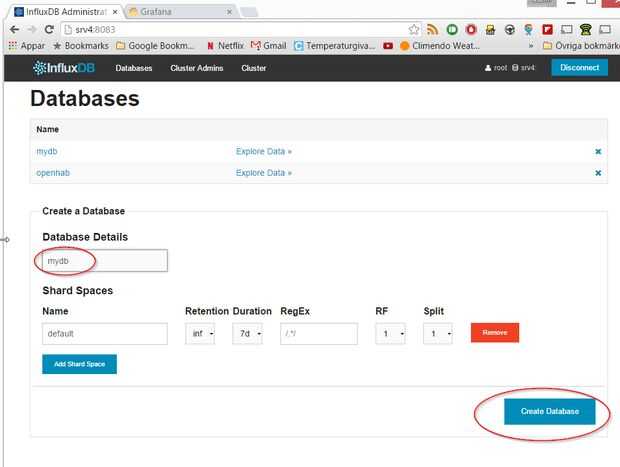 2. Crear una base de datos de métricas (mydb) con la configuración predeterminada. Ver captura de pantalla. Usted puede utilizar un nombre diferente pero tienes que cambiar referencias a mydb más adelante en el instructable.