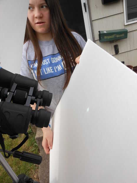 Sujete la otra pieza del tablero de la espuma sobre un pie más o menos detrás de la lente. Si tienes binoculares apuntando correctamente, debería aparecer una imagen del sol! Echa un vistazo a continuación para algunas de las fotos que tomé del proceso.
