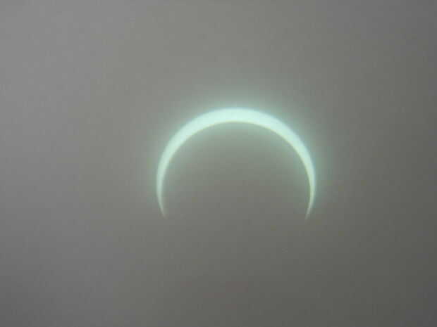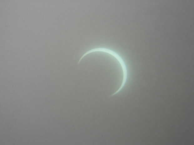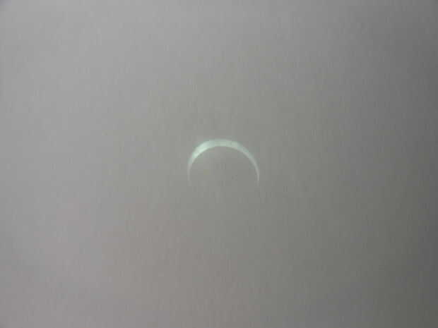 Lo hice en un día nublado. Las nubes eran bastante delgada y alta para la mayoría del eclipse, así que no era demasiado malo de un problema, pero hacia el final más pesadas nubes comenzaron a rodar. Me di cuenta que como las nubes adelgazado era capaz de mover al tablero más lejos de los prismáticos, proyectando una mayor y más clara imagen. En un día sin nubes, podrá sostener la Junta bastante lejos de los prismáticos, hacer una imagen grande y detallada!