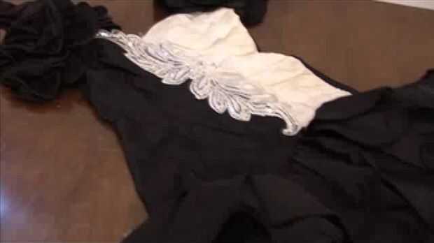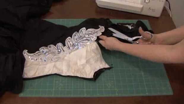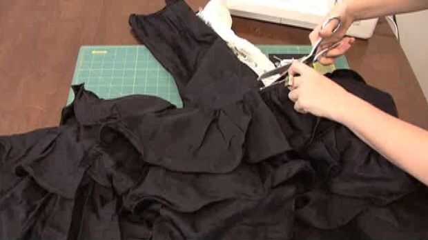 4. luego cortar la falda. Si usted tiene volantes en la parte inferior, como lo hicimos, separar los volantes de la falda principal para obtener un pedazo grande de tela plana.