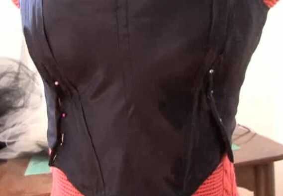 15. Acople la parte posterior de su corsé cosiendo, corchete, o insertando gromits para sostener la cinta de encaje hasta la espalda. Pruébate la prenda adentro hacia fuera. Pellizcar, pin y coser los dardos a lo largo de la frente y los lados del corsé, para hacer el ajuste perfecto.