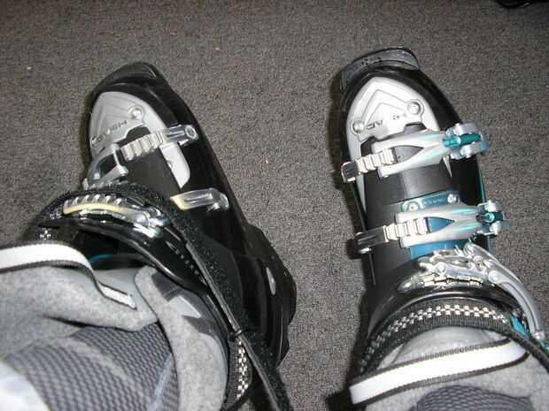 Poner un par de calcetines calientes y poner tus botas de esquí. Bloqueo y apriete todos los enlaces de tus botas por lo que no puede mover los tobillos en ellos o podría lastimarse potencialmente al esquí.
