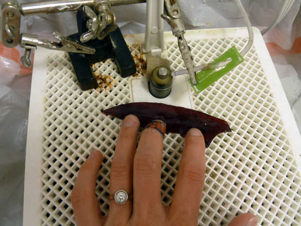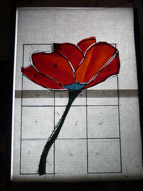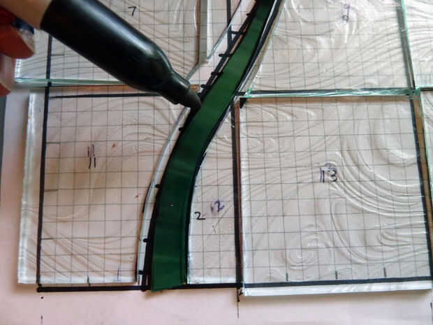 Pongo las piezas en el patrón en la caja de luz por lo que yo puedo dibujar líneas correctivas según sea necesario (ver segunda imagen). Tomo las piezas a la muela y suavemente a moler los bordes ásperos y afinar las formas. Ser paciente-demasiada presión contra el disco de amolado puede causar el vidrio chip!