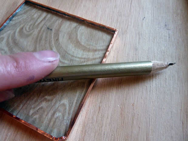 Frote los bordes de la hoja a lo largo de los bordes anterior y posterior del vidrio con un instrumento firme (este lápiz suave no fue rival para los rincones difíciles de vidrio). Tenga cuidado para asegurarse de que la cinta está muy firmemente adherido e incluso. Si obtiene agrupado para arriba, sólo arrancar esa sección y empezar de nuevo. Siempre puede superponer trozos de lámina de cobre, pero tenga cuidado para alinear los bordes o bien que se vean cuando soldado!
