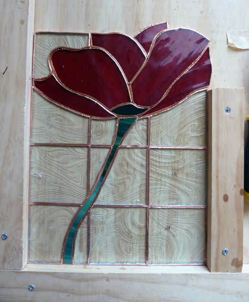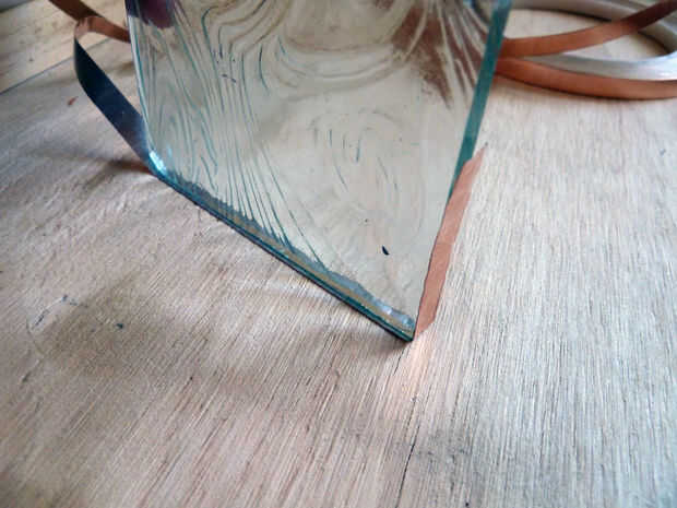 Una vez que usted haya decidido sobre el grosor adecuado de lámina de cobre para su vidrio, pelar la protectora de la lámina. Centro que de cristal en la cinta y presione firmemente a lo largo de los bordes cortados.