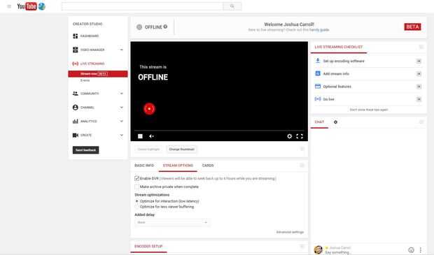 Para transmisión en YouTube en vivo, iniciar sesión en YouTube con tu cuenta de Google, luego buscar al tablero corriente de vivir en https://www.youtube.com/live_dashboard. En esta página, encontrará una lista de Streaming en vivo en el lado derecho de la página; Esto le llevará a través de todo lo que necesita para preparar su transmisión en vivo: